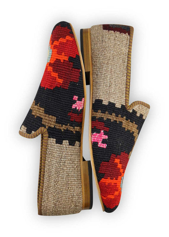 Kilims are a style of textile traditionally crafted on Turkey's Anatolian peninsula, primarily woven from wool on a cotton ground. Kilims are flat-woven, featuring a thin, tight weave that make them a perfect textile for crafting shoes and accessories. Every symbol, color, and pattern woven into the Kilim has meaning and represents a hope, a dream, or a story from the life of the weaver.