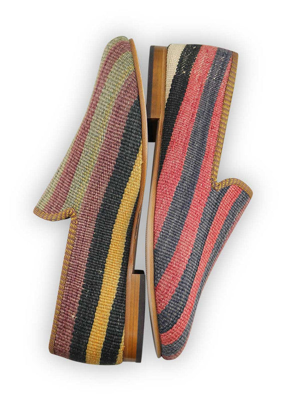 Kilims are a style of textile traditionally crafted on Turkey's Anatolian peninsula, primarily woven from wool on a cotton ground. Kilims are flat-woven, featuring a thin, tight weave that make them a perfect textile for crafting shoes and accessories. Every symbol, color, and pattern woven into the Kilim has meaning and represents a hope, a dream, or a story from the life of the weaver.