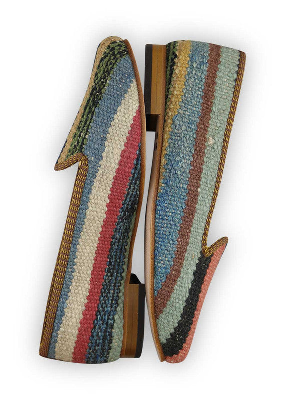 Kilims are a style of textile traditionally crafted on Turkey's Anatolian peninsula, primarily woven from wool on a cotton ground. Kilims are flat-woven, featuring a thin, tight weave that make them a perfect textile for crafting shoes and accessories. Every symbol, color, and pattern woven into the Kilim has meaning and represents a hope, a dream, or a story from the life of the weaver.