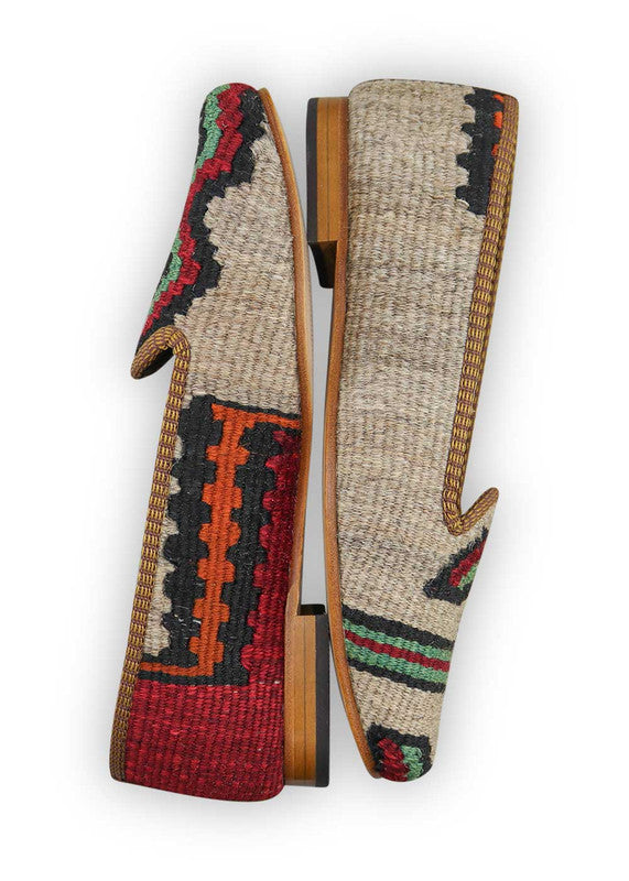Kilims are a style of textile traditionally crafted on Turkey's Anatolian peninsula, primarily woven from wool on a cotton ground. Kilims are flat-woven, featuring a thin, tight weave that make them a perfect textile for crafting shoes and accessories. Every symbol, color, and pattern woven into the Kilim has meaning and represents a hope, a dream, or a story from the life of the weaver.